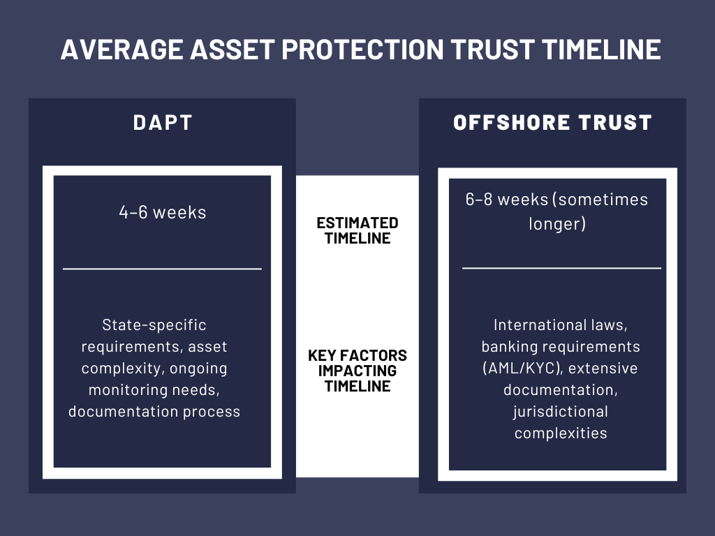 Setting up a Domestic Asset Protection Trust (DAPT) typically takes 4–6 weeks, though the timeline can be longer depending on the complexity of the trust and the state where it is established.