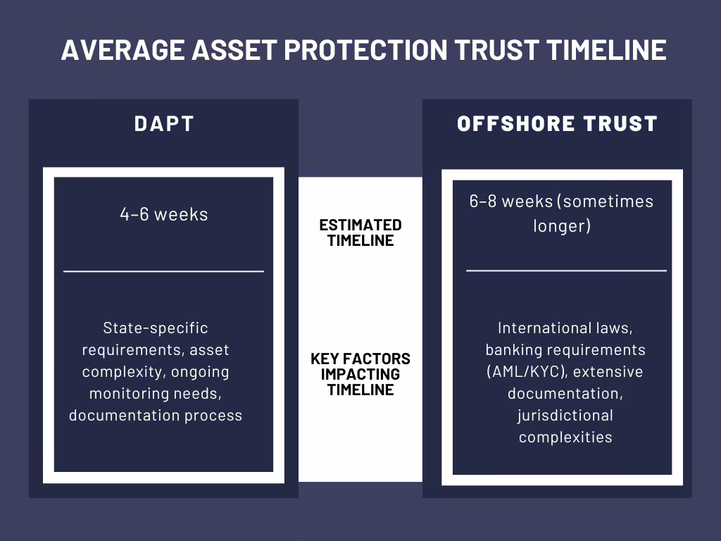 Setting up a Domestic Asset Protection Trust (DAPT) typically takes 4-6 weeks, though the timeline can be longer depending on the complexity of the trust and the state where it is established.