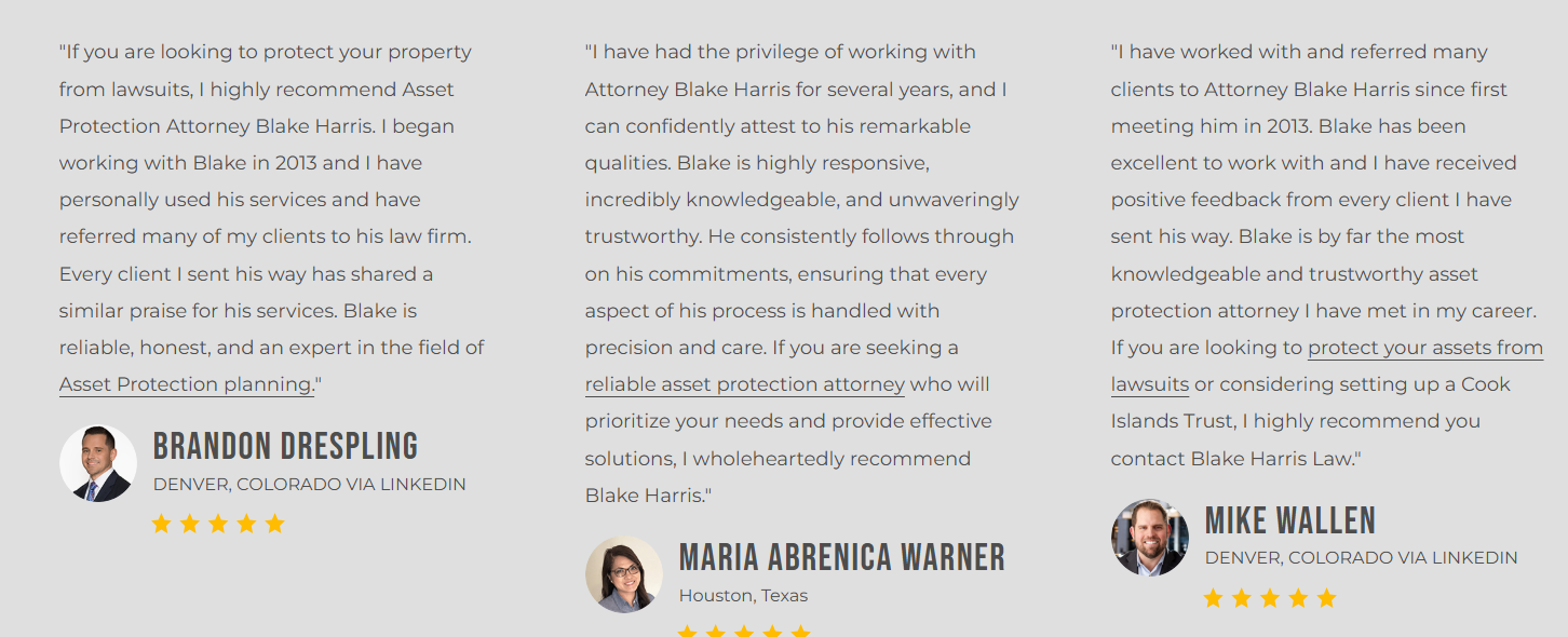 At Blake Harris Law, we partner with established offshore trustee companies to help clients develop comprehensive strategies for preserving their wealth in the best offshore trust jurisdictions.